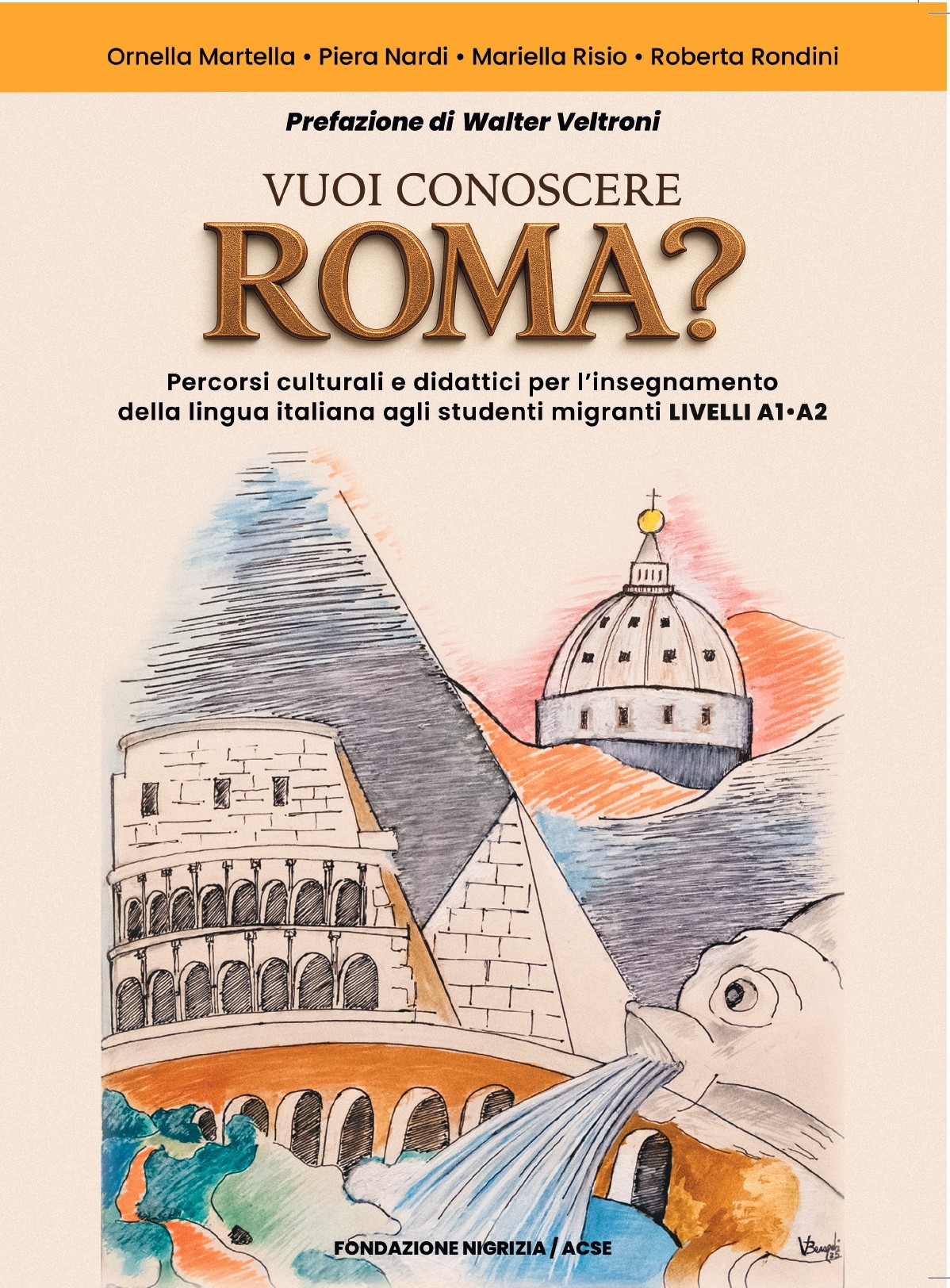 In 150 pagine propone percorsi culturali e didattici per l’insegnamento della lingua italiana agli studenti migranti di livello A1-A2. Bellissime le foto dei monumenti e delle vie di Roma. Altrettanto magnifica è la prefazione di Walter Veltroni che riportiamo di seguito.